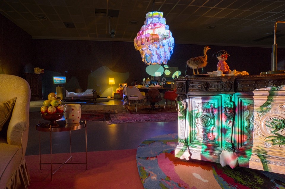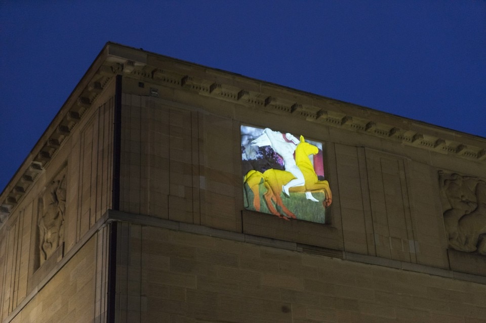 The installation in the roof space, with its “moving lights”, is designed to make an impression from outside, and can be seen from the Heimplatz and the adjoining site at night. It covers an area of several hundred square metres of glass together with the steel construction beneath and is visible far and wide during the night at certain times. The associated video projection is directed at one of the five neoclassical reliefs. The relief in question, on the north-west facade, depicts an Amazon who is fighting with a Greek and is set free by the projection.