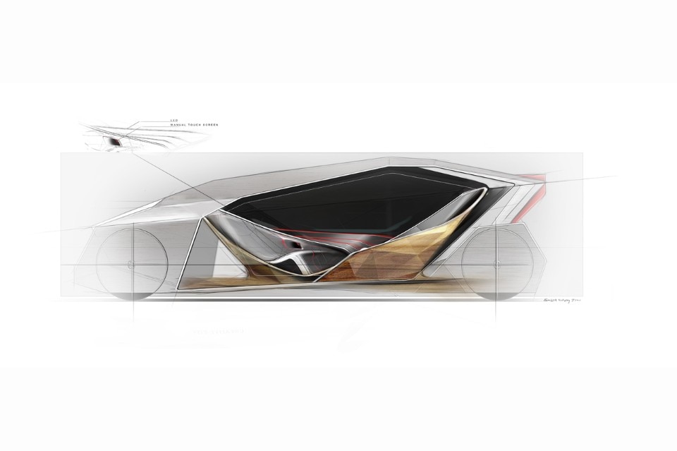 The concept car highlights a new idea of an object strong through its form, redefining the idea of chassis and of external structure, which in this case encloses the cabin shaped like a suspended “diamond”. The exterior origami protecting the diamond-cabin is made of metal composite material with an aluminium finish and is connected to a frame.