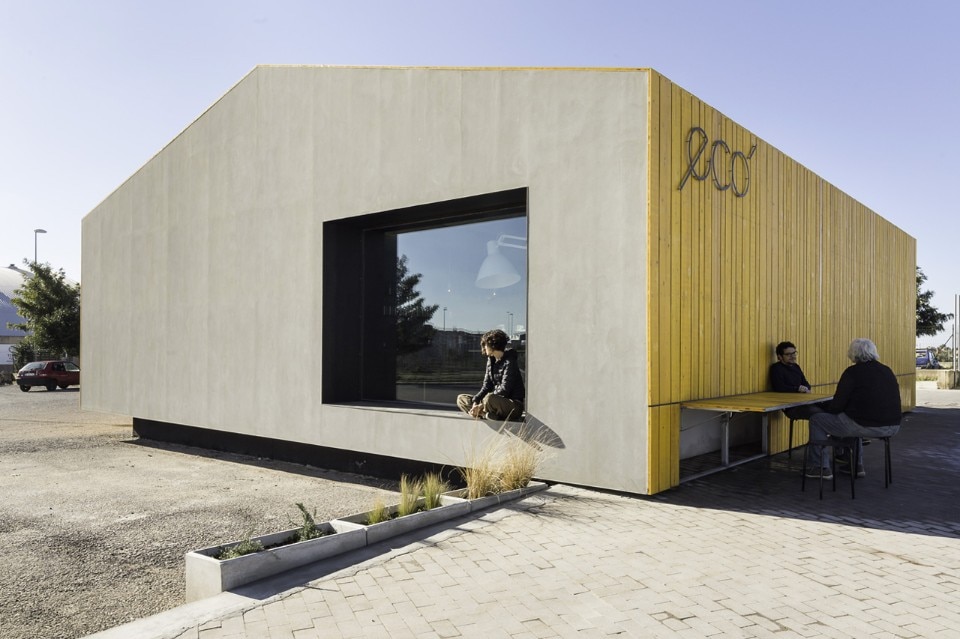 The project, in compliance with the current regulations and in respect of the budget, involves the realization of an outer skin made of low-cost and reused materials (Aquapanel® panels and carpentry wooden slats) that reshapes the building. The openings on the side façades (that look south on to the sports arena and north on to the under-construction building cooperatives) are shielded by the new filter; two large windows, the one on the entrance and the other one aligned on the opposite face, open up a view on the urban landscape. On the north façade, a part of the casing is designed to be eventually overturned creating outdoor tables.