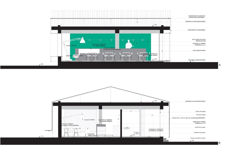 Inside, a wall enamelled with a green polyurethane resin separates the work area from the customers’ area. Beams and pillars are left in fair-faced concrete and the floor is made of industrial concrete screed smoothened and treated with a transparent resin. The bar counter, as a full block, is made of iron sheets and the furniture recall vintage retro styles.