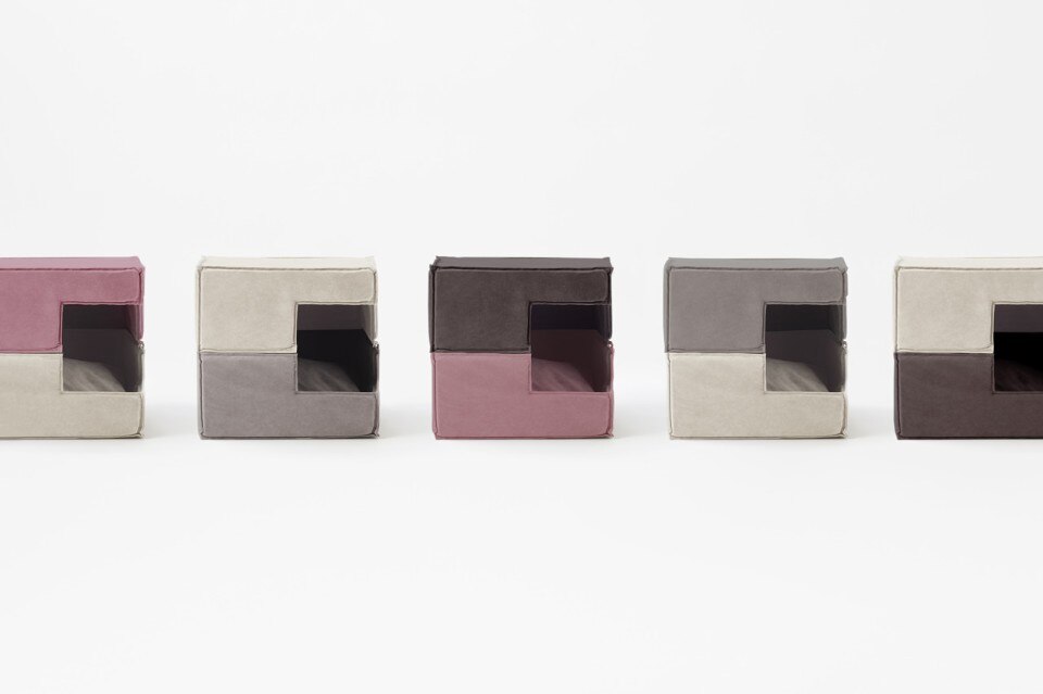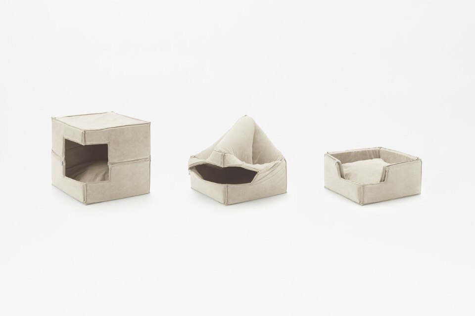 Nendo, cubic pet goods, by | n. A dog house in the shape of a cube consists of two pieces, an upper part and a lower part, which are connected via a zip fastener.