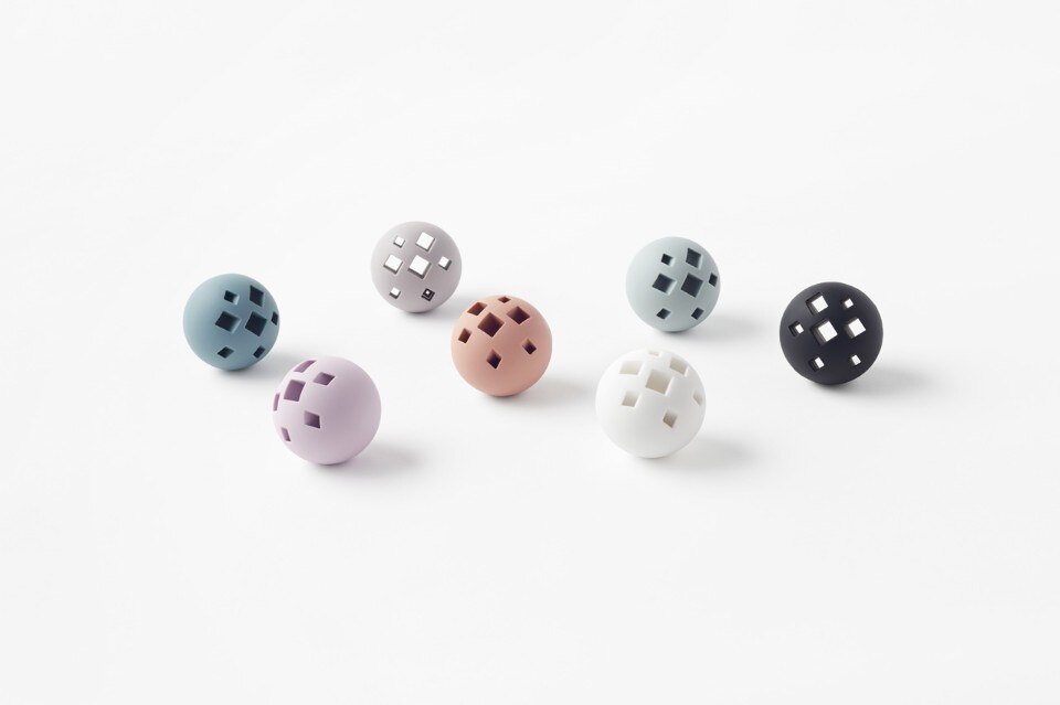 Nendo, cubic pet goods, by | n. A toy ball with a number of square holes in it. When a snack is placed in the holes, dogs can have fun with the ball trying to get the snack out.