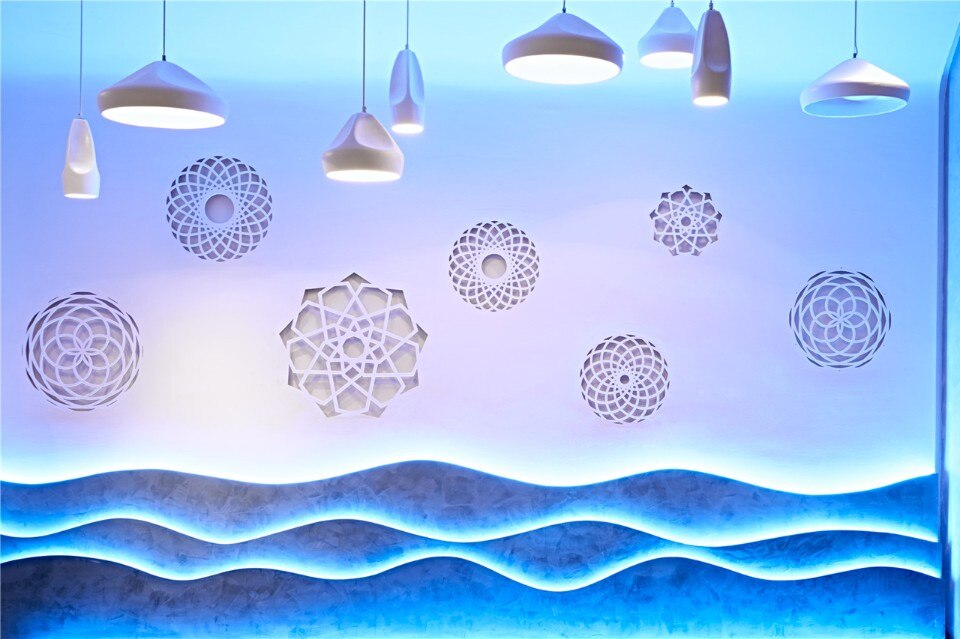 The concept of “comfort” drives the overall layout of the restaurant. In order to meet the demands of small gatherings, the lighting design creates a private cozy spatial feeling by using accent lighting strategy. And in order to emphasize the star product of Xi Ding, “the seafood dumpling”, RIGIdesign plans a marine subject zone by using wave pattern and blue led wall wash lighting on the side background wall, which also increases the comprehensive spatial experience.