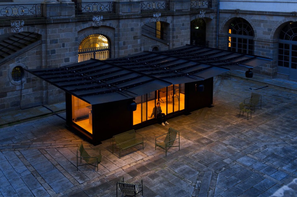 Le parlement de Bretagne’s internal courtyard houses one of the projects conceived for public spaces. The Kiosque (2015) is an autonomous, movable space. It is made of a steel structure with large bay windows and a protective roof that forms a kind of external terrace. Lanterns are suspended at each end of the roof, lighting the entire covered surface. In Rennes, the Kiosque is associated with Palissade (2015), a collection of outdoor furniture, conceived for the Danish brand Hay. In an environment with exceptional heritage value, the installation is open to a variety of usages. It is a place where people can pause and relax, but it can also be an “active” venue housing concerts, conferences, meetings etc.