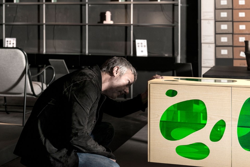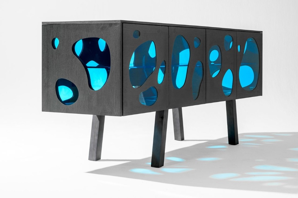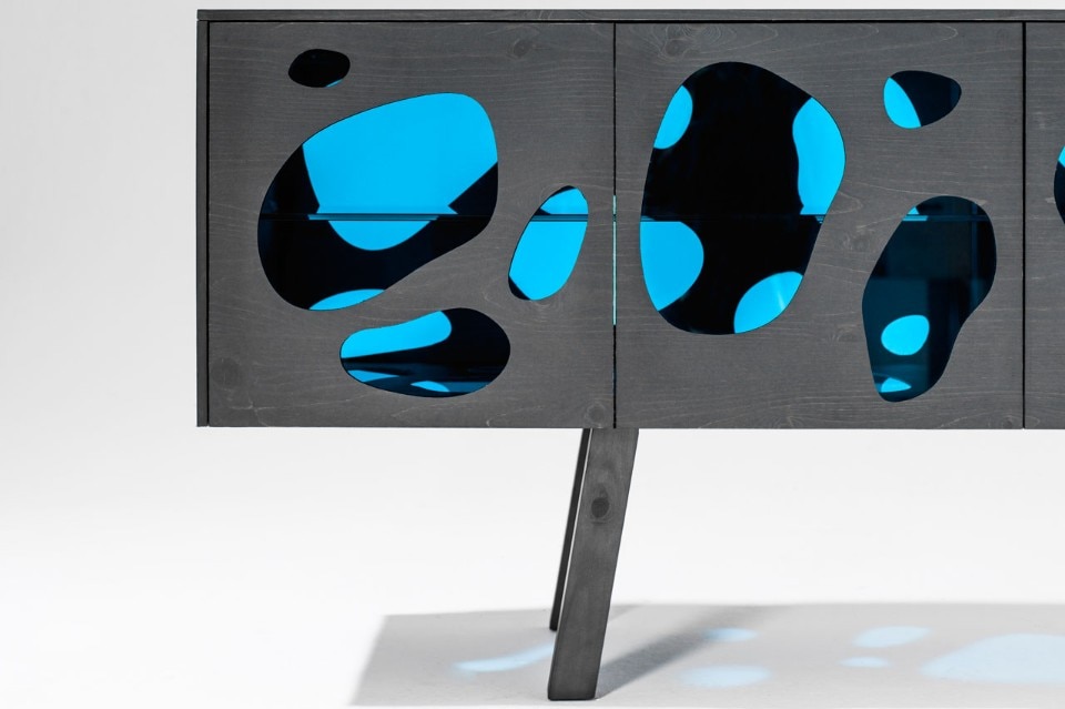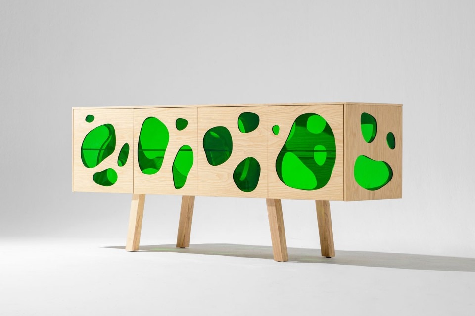 And Fernando adds: “The sideboard is made out of ash wood and green glass doors. There are glass shelves inside the buffet in order to avoid cutting the light and the transparency of the material. Two different color versions will be available.”