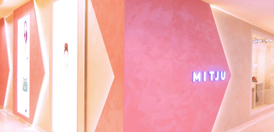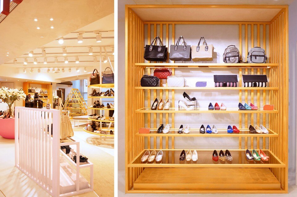 The overall colour and material selection is kept to a limited palette. Velvety plasters sourced from Italy are applied onto most external and internal walls to create smooth soft surfaces that can display a variety of shades within the hue depending on which angle you look at it. Sand textured paint from Italy are also painted by hand to the geometrically shaped shoe displays to add interest when observed up close.