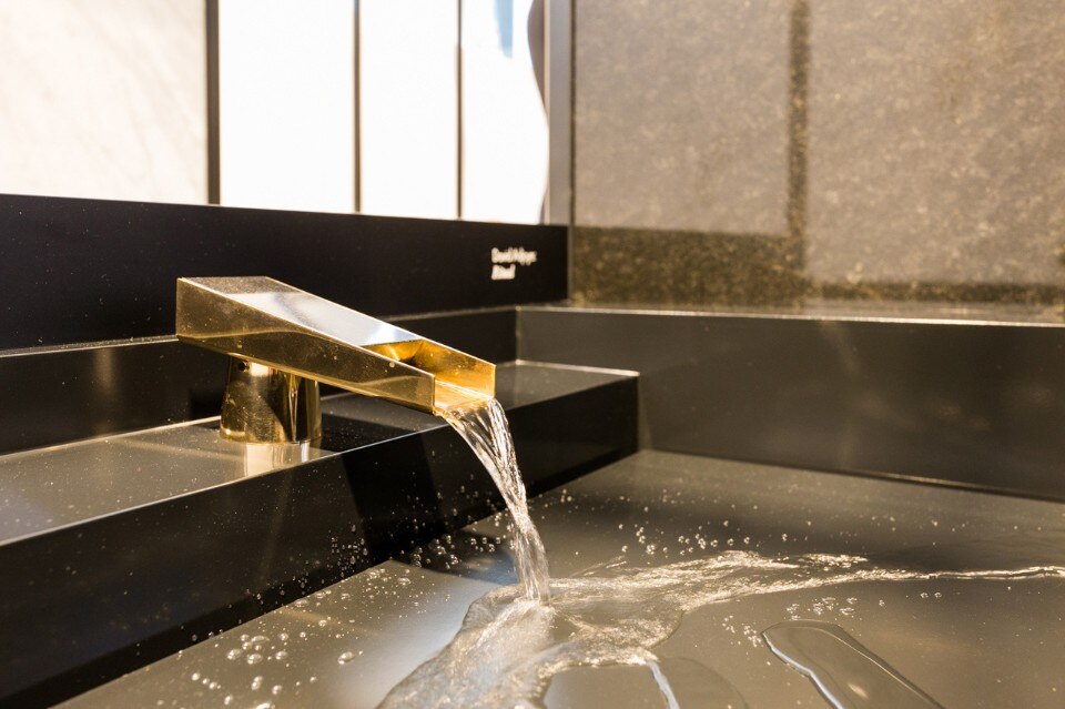 David Adjaye celebrates the ritual of the modern luxury of running water: the tap is trasformed into a valuable object – a sculpture of bronze and granite opening upward, honouring water.
