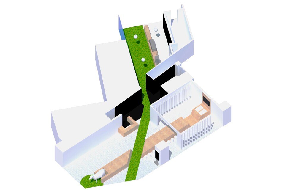 The table was divided in two at one point. A green carpet ran between, leading to the cashier in the back, while further in the back were a kitchen and a counter where desserts were served. The former owner of the place who used to run a restaurant here had difficulties trying to attract customers to this space in the back, so to solve this problem the counter was redesigned to be a special place serving desserts.