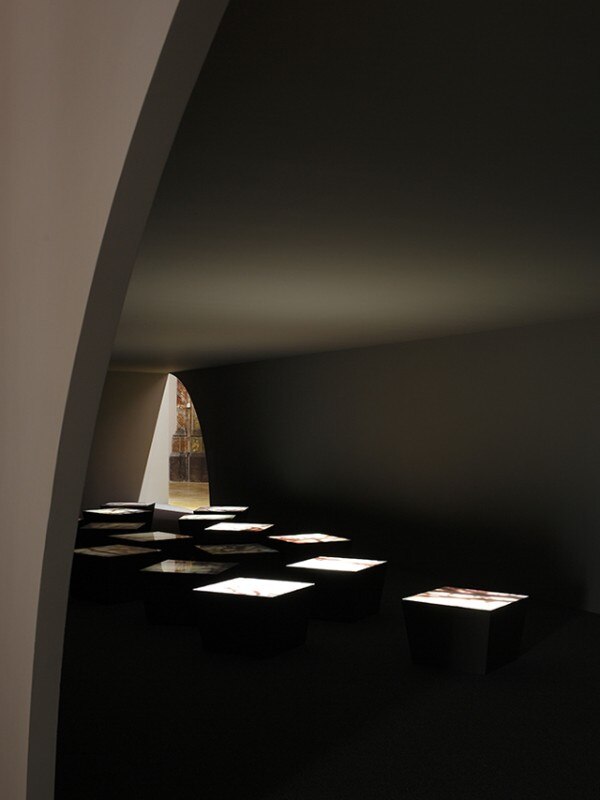 The Carré Sainte-Anne is a former neo-Gothic church converted into a contemporary art center. The concept of the YOD pavilion was to design a case in harmony with the place, arousing curiosity and announcing the work kept inside. The structure is a space immersed into darkness, containing a set of drawings which are embedded in backlit metal tanks with light variations.