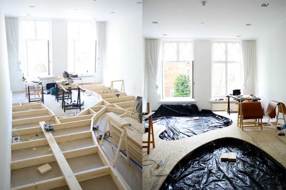 The installation was conceived for the Amsterdam Art Fair, a 5 day event in the center of Amsterdam. The materials used for the installation, refer to the typical art fair atmosphere with the felt event-flooring and plastic like houseplants, while chairs follow the typology of the outdoor foldable chair are detailed and materialized in such a way that they fit the high end atmosphere of the building.