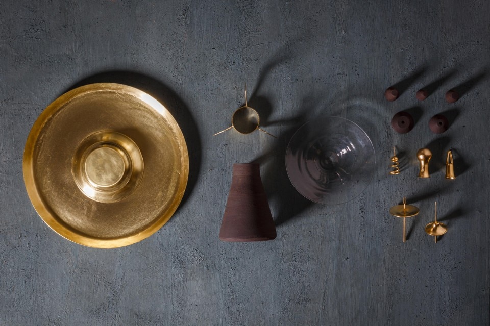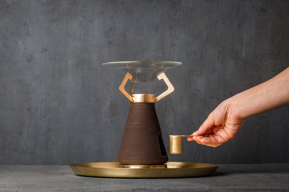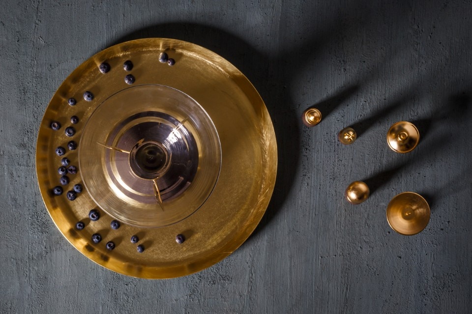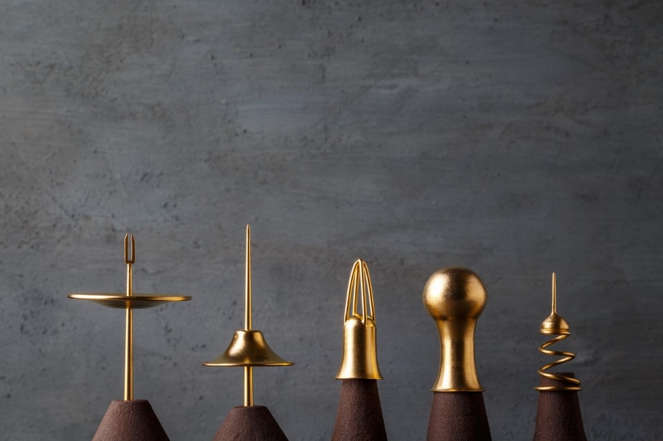 The set was produced with the metal spinning and jewelry design techniques, glass blowing and ceramic potter’s wheel. The eating utensils are plated with gold and placed on a black ceramic stand.