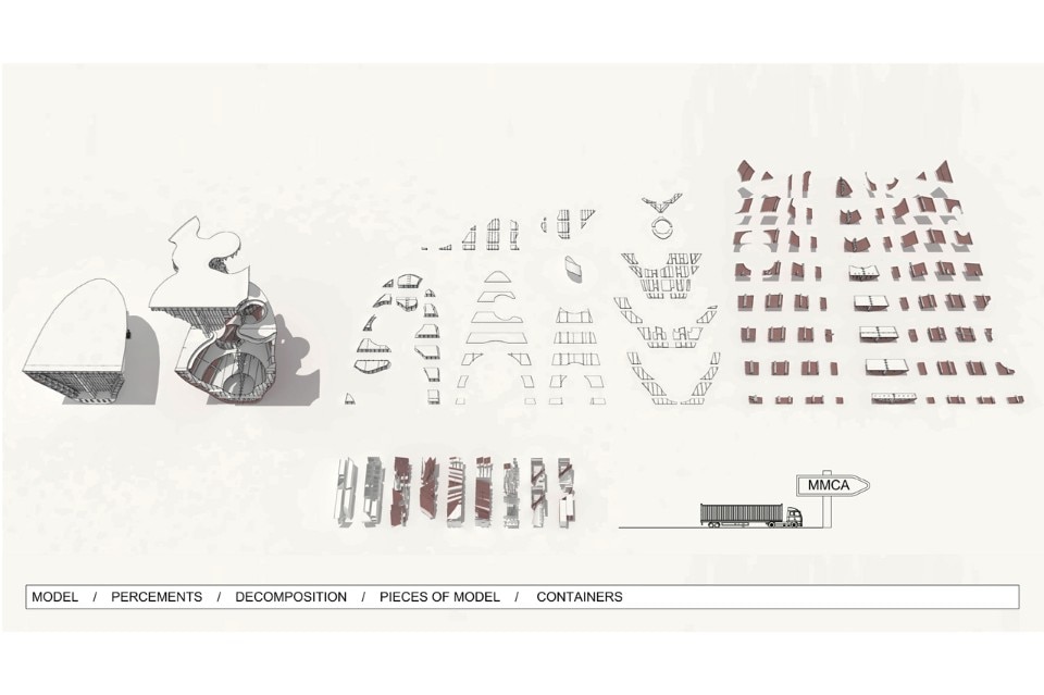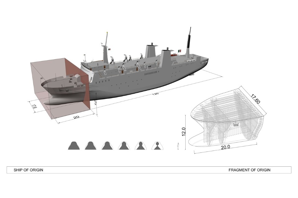 This upside down massive metal structure situated at the entrance of the museum’s courtyard, encourages curiosity and becomes an invitation to visit the project. The front surface curve of the ship may lead people to the museum, as it opens towards its main entrance.