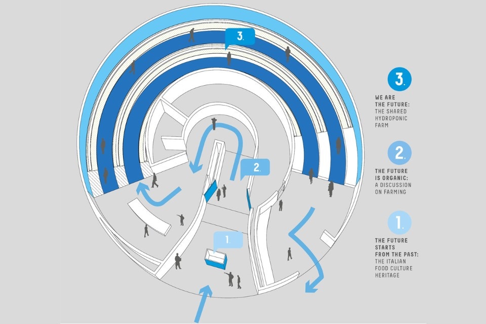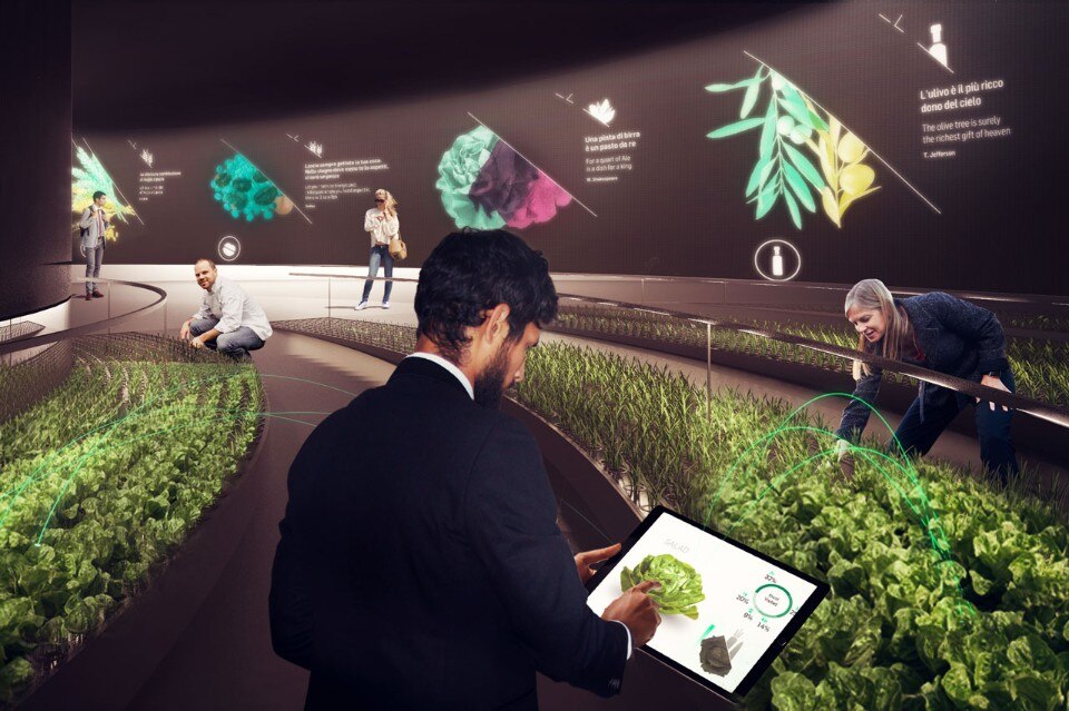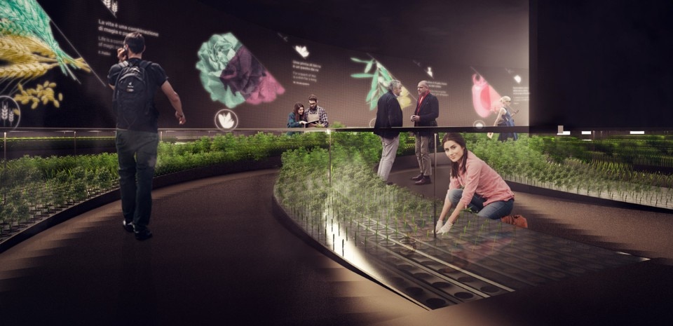 Visitors will enter the “Area del Futuro” (Area of the Future) and follow an immersive route that leads to a vast indoor hydroponic vegetable garden. Here, anybody can choose to plant seeds in a hydroponic tank, and monitor their growth. In fact, the “Area del Futuro” is designed in such a way as to highlight the whole sequence of the maturation process. The hydroponic tank itself slides fluidly throughout the farm as if on a conveyer belt, exhibiting the many stages of plant growth.