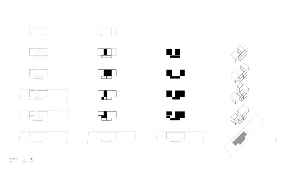 The evolution of design was based on a clear distinction between two main volumes which are both stretched east-west: a larger one in grey that contains all the served spaces; and a smaller replica in black that accommodates all the servant spaces. In order to maintain a sense of autonomy all the major glazed openings on the larger volume are connected and the exterior of this modest monolithic mass is rendered in seamless stucco.