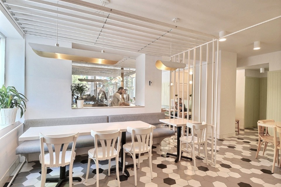 After spending two years on wheels, the Pista Café Mobile in Montreal settles down in a luminous café designed by Les Ateliers Guyon, shifting from nomad to sedentary.