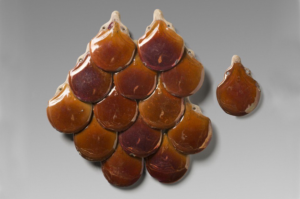 Roof tiles, Jaume Pujol i Bausis & Sons ceramics factory. Esplugues de Llobregat, 1875-1924, porcelain decorated with scale-like lustreware, Ceràmiques Vallvé donation, 1984. Museu del Disseny de Barcelona. Photo Guillem Fernández-Huerta