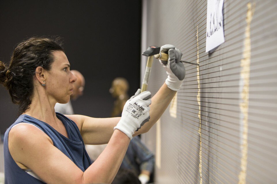 Above: Andrea Mastrovito, Sala Tachipirina, engraving on wooden panels, 257 x 590 cm, 16th Ermanno Casoli Award, Ancona, 2016