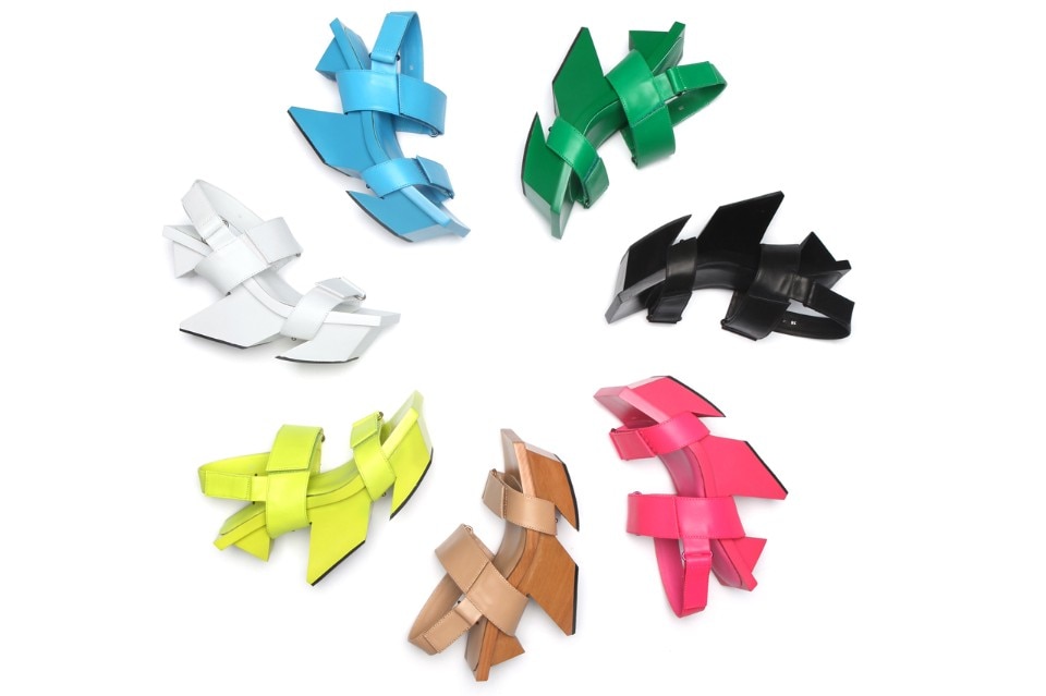 The Rock collection sees shoes as architecture. Their manufacturing incorporates cutting-edge materials and puts the people who will wear them at the forefront of the design process, with a functional and playful approach. Rock is based on the concept of structure, translated into dynamic, structured heels, available in six colors: white, black, pink, beige, yellow and green.