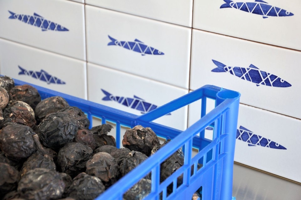 Studiocharlie designed a collection of tiles in laquered terracotta that depicts sardines, anchovies and mackerels, in an attempt to reduce the interiors’ background noise.