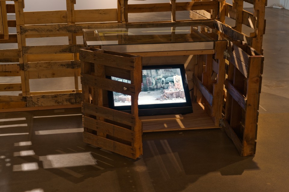 Single-channel HD video with color and sound, enamel, emulsion on silk, aluminum, pallets. Courtesy of the artist and Susanne Vielmetter Los Angeles Projects