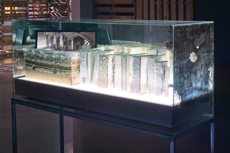 Edgar Arceneaux, A Time to Break Silence: The Trading Futures Constellation, 2013. HD video, color and sound, 65 min. Books, crystallized sugar, vitrine, monitor