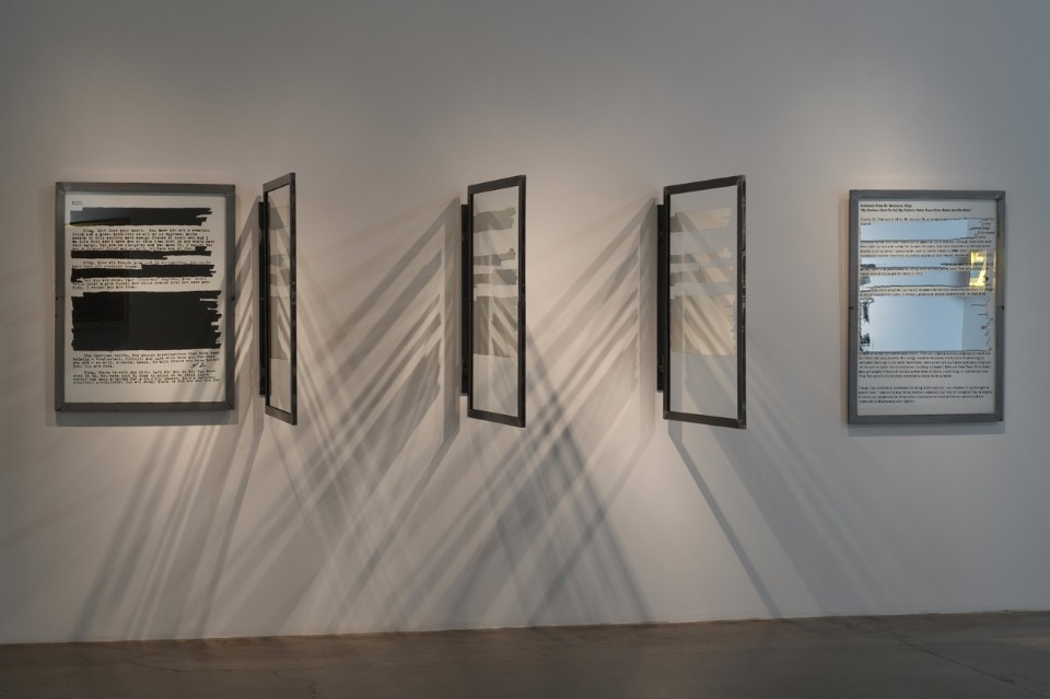 Edgar Arceneaux, A Book and A Medal II (Unredacted), 2014 – 2015. Seven parts, silver, painting on mirrored glass, handcrafted steel frame and light boxes. Courtesy of the artist and Susanne Vielmetter Los Angeles Projects, photo Robert Wedemeyer