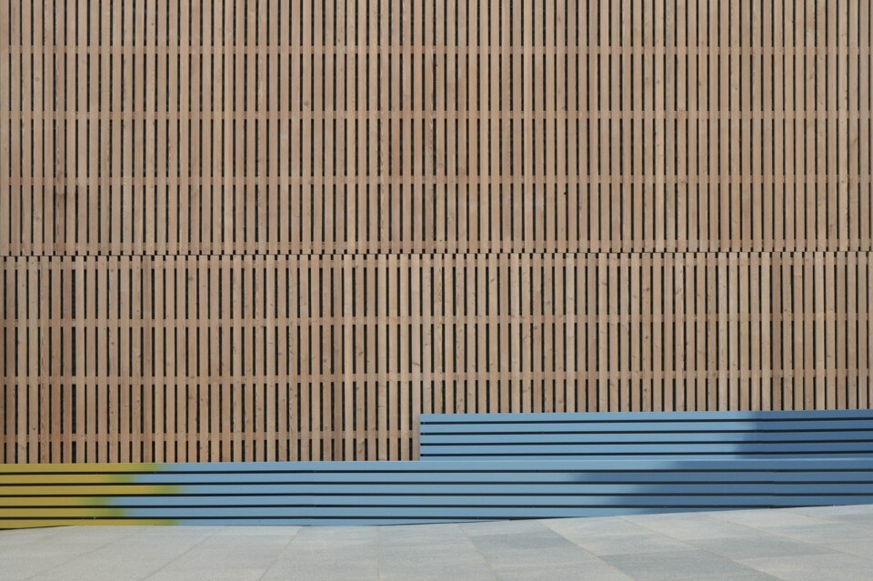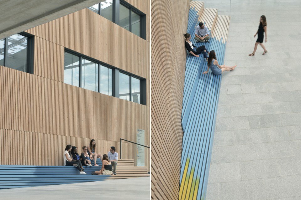 The entrance was abandoned by the students due to a lack of seats, now it has been enhanced with a row of seats. This addition makes the building more welcoming and has a double use. The row of seats snugly fits the sloping ground and brings a colourful dynamic to the area through its gradients. Deliberately ambiguous regarding function and aesthetics (rest or teaching), this seating system allows you to pause between two lessons, but it is also a “line”, an arrow prompting busy visitors to cross the space to reach the reception located several metres further on.