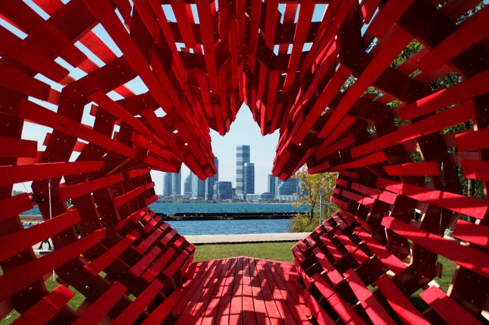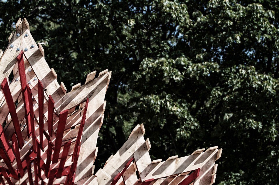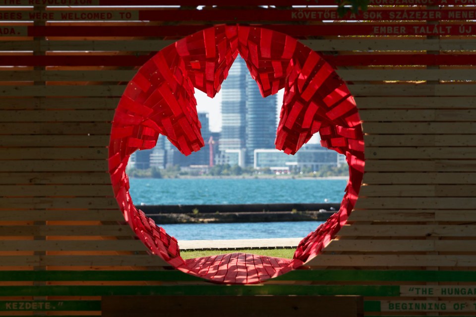 Hello Wood team’s installation built by Lake Ontario forms a tunnel. The entrance is the symbol of the spirit of the revolution of 1956: the Hungarian flag with a hole in the middle – protesters cutted out the communist coat of arms from the Hungarian flag during the demonstrations.