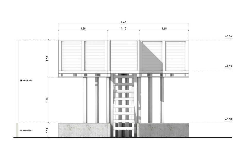 The piece consists of two levels – a higher level for observation and introspection, a lower one for rest and stay. Each of them is made of distinct materials with different resistance to time, all built through processes of autoconstruction and in collaboration with local artisans and volunteers. The top level that will last for a given time period and is easy to disassemble for storage and maintenance purposes is in cryptomeria wood (or Sugi, an endemic Japanese tree also abundant on the island of S. Miguel).