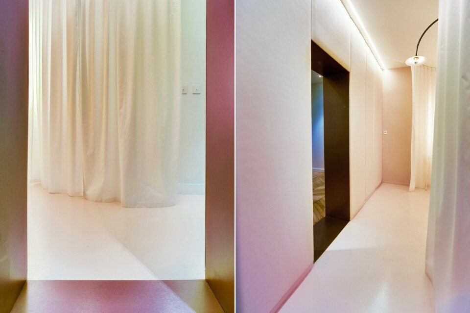 This room will be built on the confrontation of materials evoking the skin and the textile. The wall between the ‘traffic’ zone and the boudoir is covered with leather wall hangings to enhance the stuffy effect of the room and to weaken noises. Ground and walls are painted nude to evoke the skin enrolling in the lexicon of the body and creating a dissociation of space between the boudoir and the cabinet.