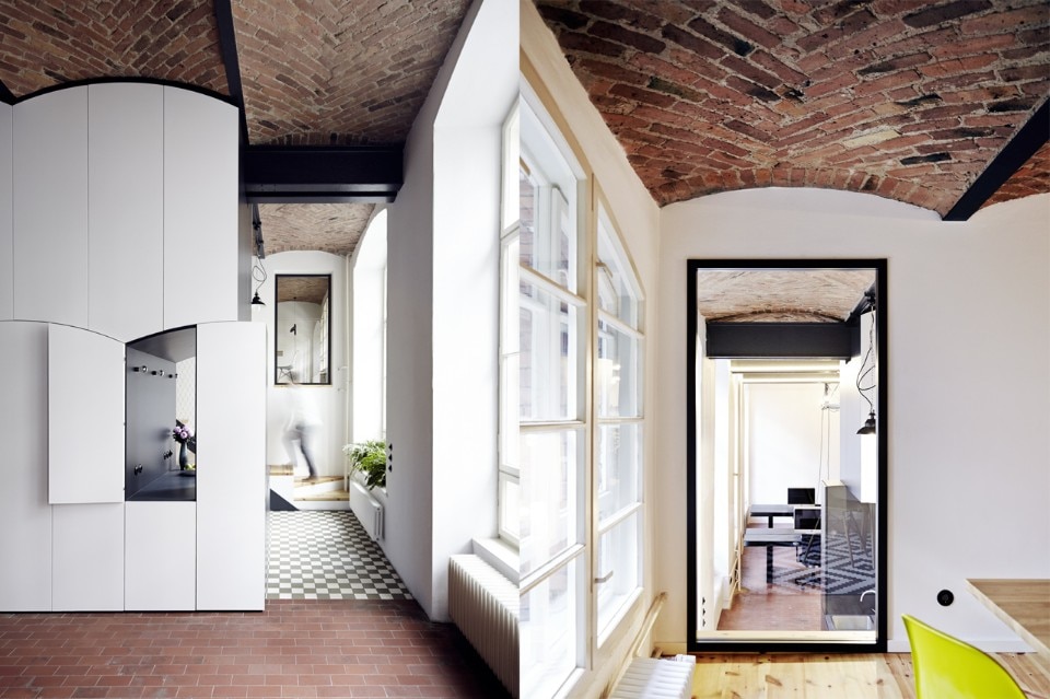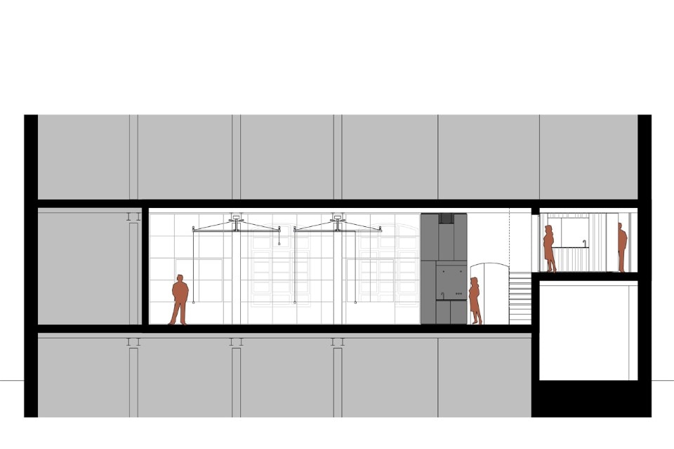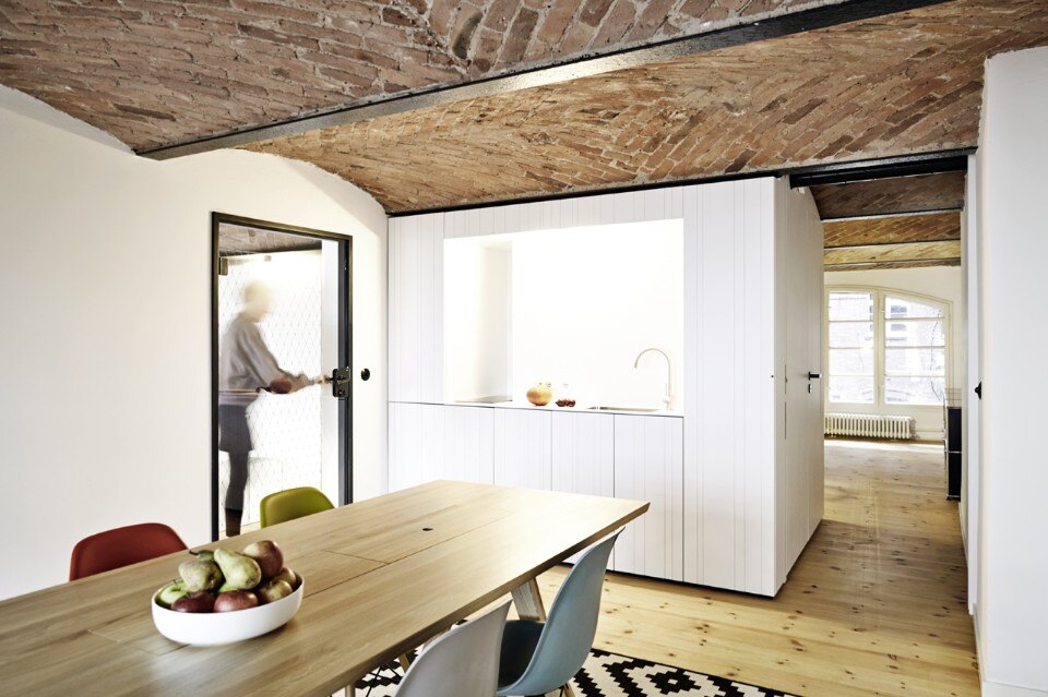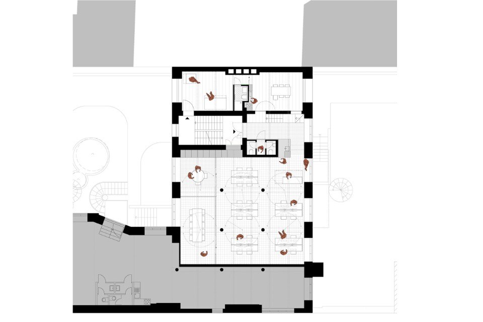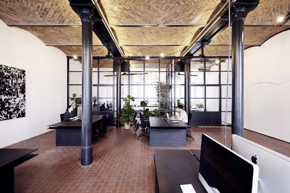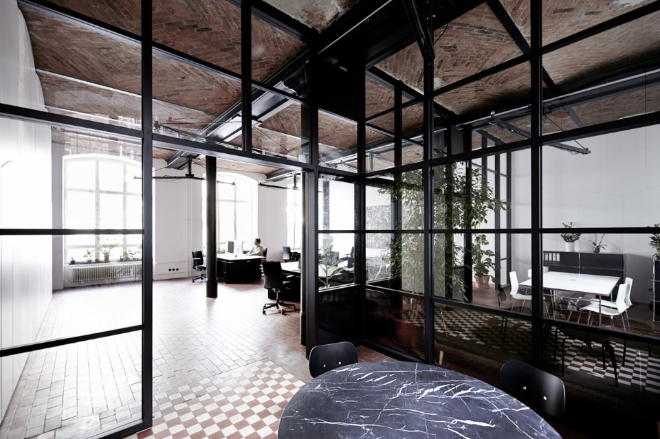Sanitation facilities and a little kitchen were also missing. An especially interesting problem to solve was the power and data supply of the new workplaces in a building, without destroying the original material. Called the “Schokoladenfabrik” the building is one of the oldest preserved commercial buildings in this part of Berlin. All design considerations were driven by the wish to show and preserve the existing in it’s original form. The removal of later additions and unorderly structures was therefore the starting point for the spacial concept where the whole unit was reorganized, with added structures.