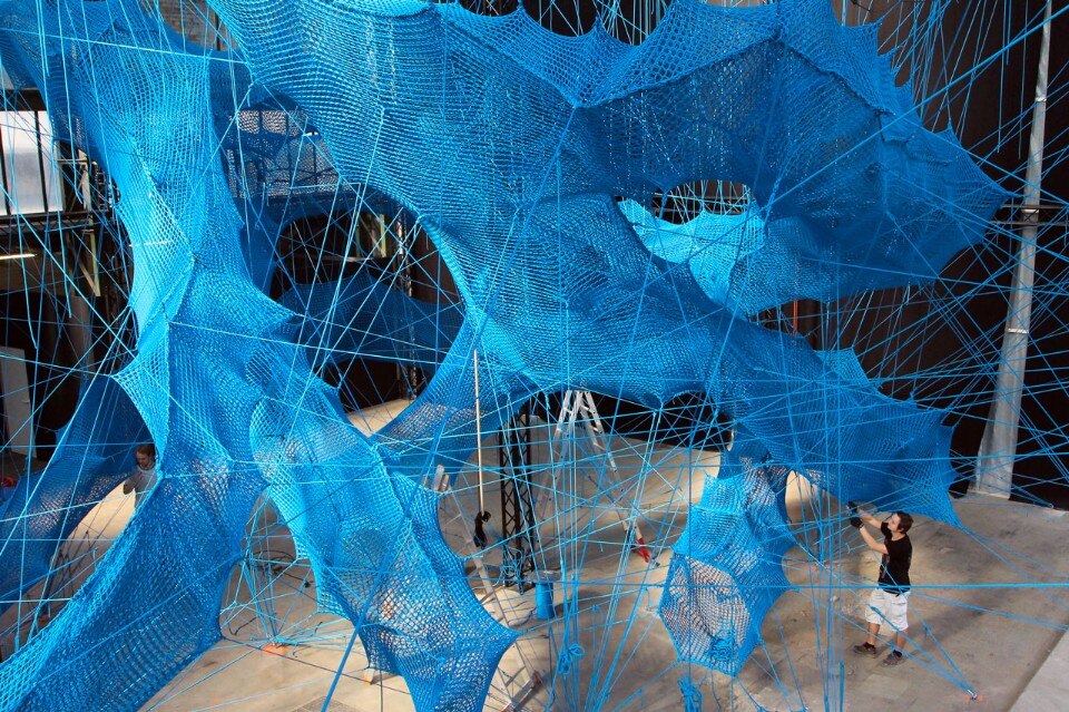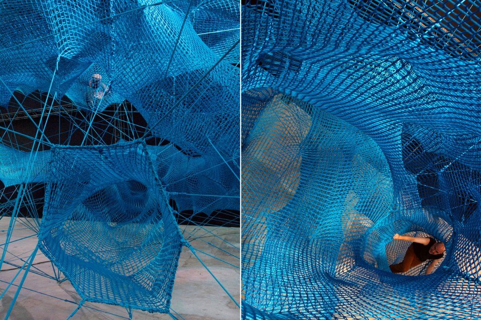 Constructed of stitched safety nets, Numen / For Use’s installation in Cologne assumes forms of closed hoses that pulsates and oscillates in the longitudinal section.