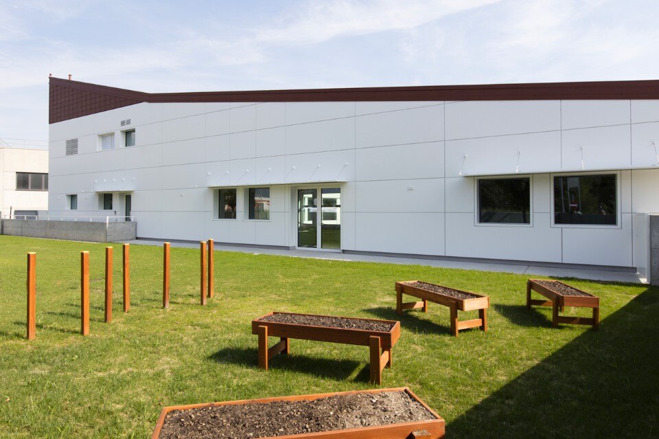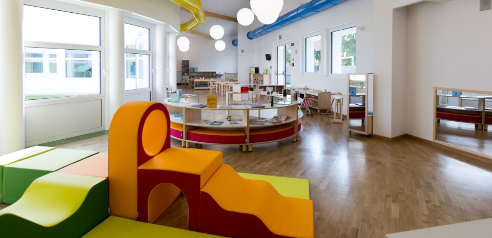 The kindergarten is a sail-like structure pointing northeast, as if wanting to touch the nearby peaks of the pre-Alps mountain range that crowns this region. In the middle lies a private garden, round like the sun, a protected territory specially designed for toddlers. The central garden favours contact between indoors and out, and floods the rooms around it with natural light.