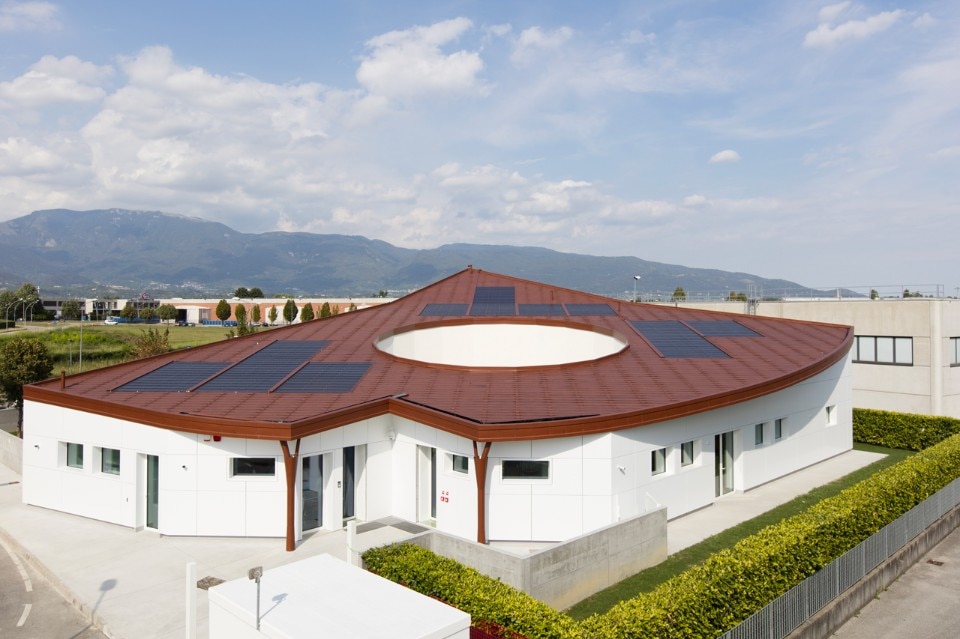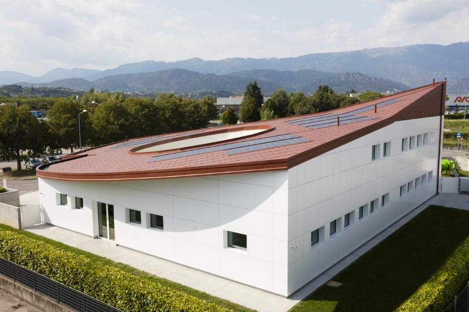The design of the building is easy to read, but not banal. Pure white facades give a rational and two-dimensional impression that contrasts with the coloured metal roof, shapes as a paraboloid leaf. The perimeter walls, made of brick and cement, are ennobled by a skin designed by Permasteelisa. In line with its company philosophy, it devised a facade that responds to the aesthetic needs contained in the architect’s visual language, and resolved the technological challenges that the building needed to face.
