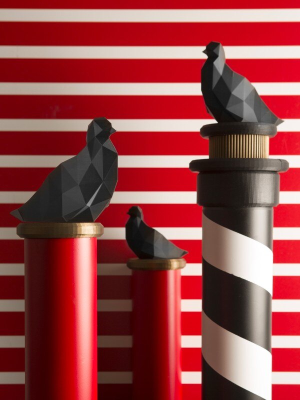 This is how Oseléto (lithe bird in Venetian) was conceived, where the memory of a trip is crystallised in a light object, that keeps you company, that is quickly associated with the pigeon, being the symbol of a minor Venice yet icon of St Mark’s Square. Square and linear geometrical shapes build volumes and play with the light, yet do not avoid references to the House Bird made famous by the Eames but do enjoy revisiting the theme proposed by the Boroullec Brothers for Vitra. Completely executed using 3D printing, Oseléto is the first Maison 203 home accessory and is available in 2 sizes, 14 cm and 10 cm high.