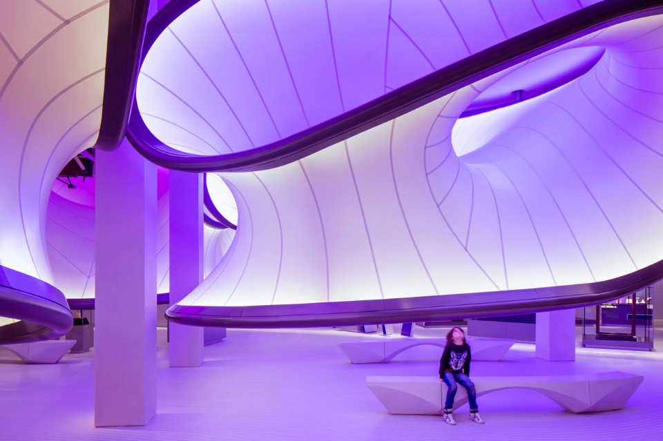 Inspired by the aircraft, the design of the Gallery is driven by equations of airflow used in the aviation industry. The layout and lines of the gallery represent the air that would have flowed around this historic aircraft in flight, from the positioning of the showcases and benches to the three-dimensional curved surfaces of the central pod structure.
