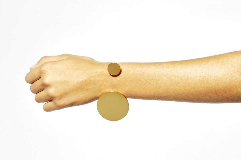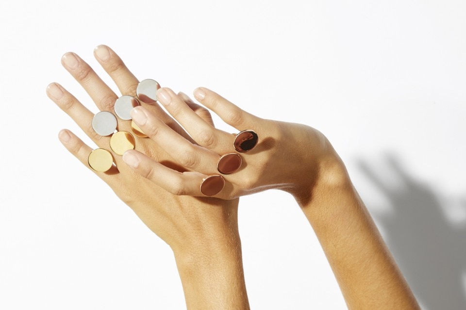 The selection of jewels for the Spring-Summer collection 2017 is made up of brass, available in different sizes and colours. The ring is seen in silver, gold and rose-gold metal, and the bracelet comes with two different sized discs in golden metal.