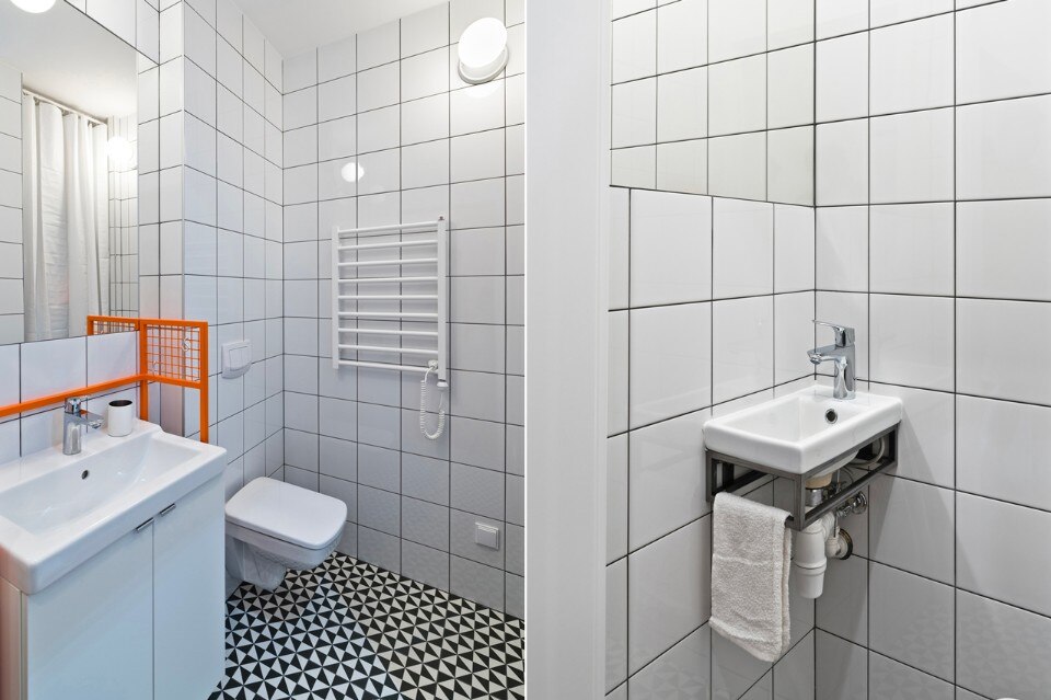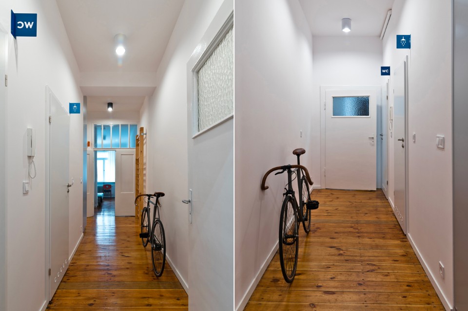 Some of the furniture, like desks – combined with radiator covers, small tables, magnetic boards, dining table and benches – has been designed specifically for this space. To highlight the apartment’s rental character there were added some identification elements such as room numbers and symbols for the bathroom and toilet. In the common area you can find an original gymnastic ladder that fits the students apartment atmosphere and can be used in several ways.