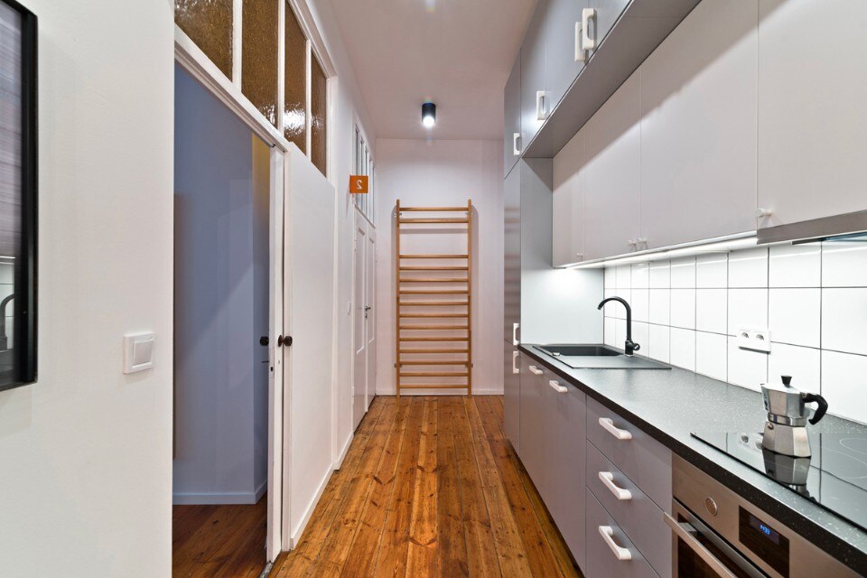 Original elements of this apartment like doors with transoms, casement windows and wooden floors were carefully preserved, hence the interior color is limited to white and gray that highlights the valuable pieces from the 30s. Few colour accents are the identification elements, applied in the frame of the kitchen table and the two walls painted in dark green.