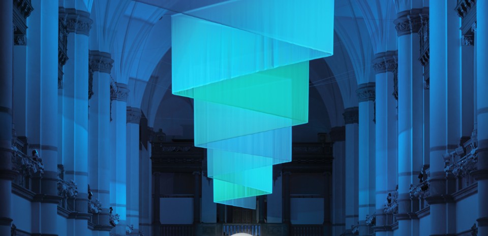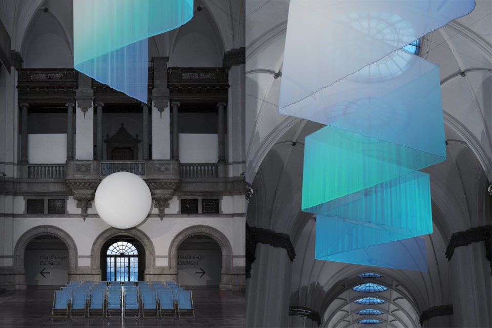 The three designers Alexis Holmqvist, Jesper Mellgren and Johannes Carlström explain that they took as inspiration the oldest sources of light available – the moon and the sun. The installation is set into the museum’s unique banquet hall – 126 meters long, 15 meters wide and 24 meters high, resembling a Gothic cathedral with high arches and pillars – which is the heart of the building. The discs of the sun and the moon creates graphical focal points in each end of the hall.