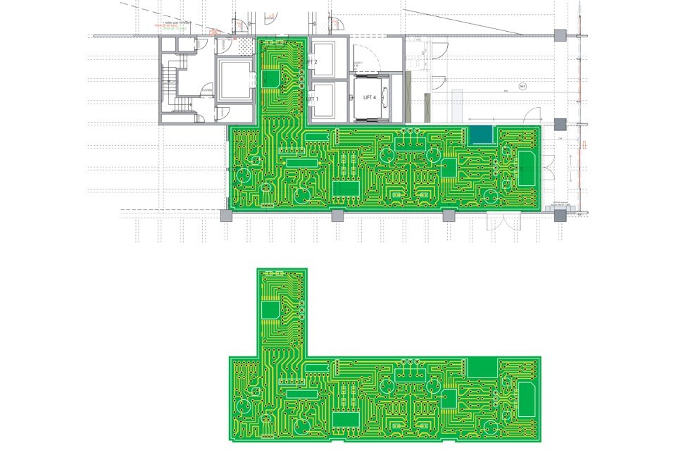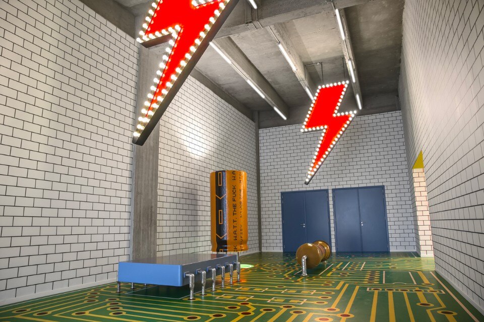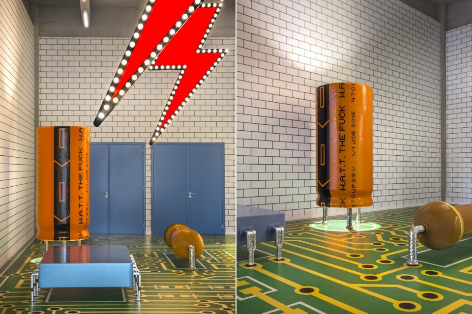 Recently film producer, art collector and project developer Mr. Serge Hannecart transformed the modernist building into a contemporary place for innovative offices. Studio Job electrified the main Lobby, with a colorful immersive installation.