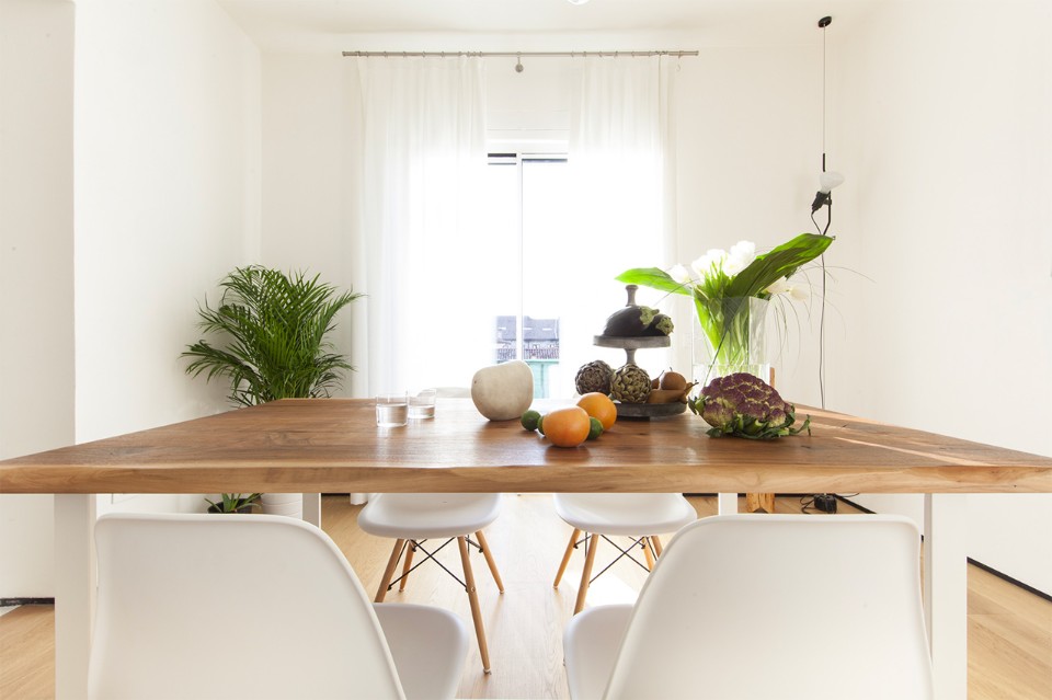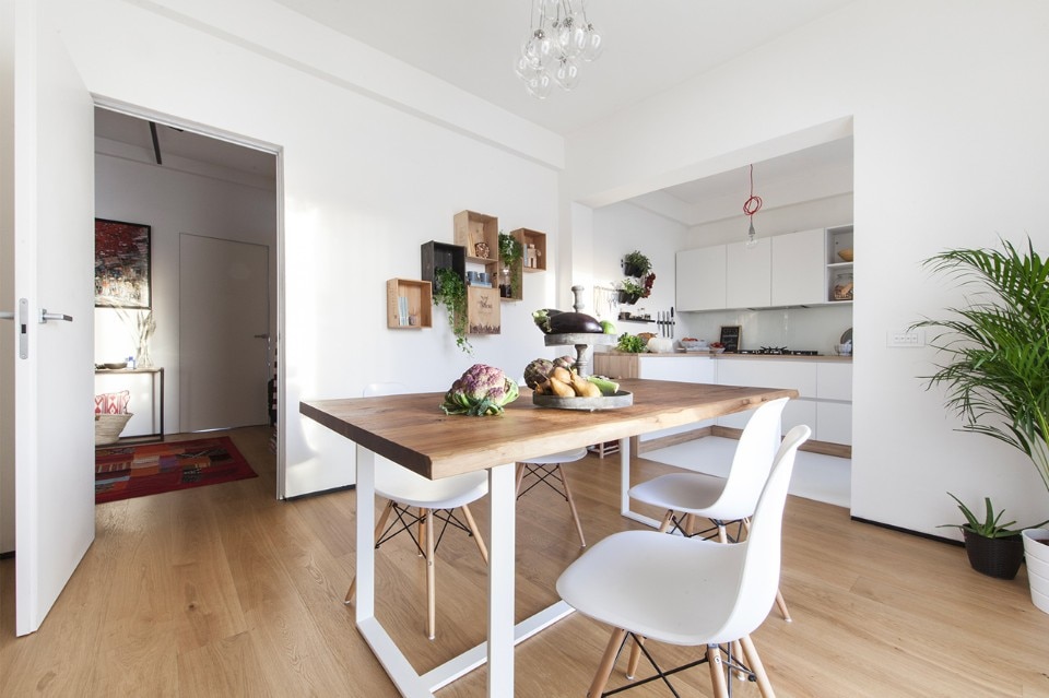 The rooms are built around the entrance lobby characterized by the presence of a large high glass window which brings light to the bathroom. The entrance lobby appears as the inner part of a silent and white cube in which, the perception of space, varies according to the opening or closing of the doors. The kitchen is divided into a dining area and a cooking zone and this separation is marked by the change of flooring, from timber to white resin. The living room is interpreted as an intimate space for relaxation where lighting is soft and concentrated in selected spots. The bathroom has been completely redone using white resin surfaces, wood and a blue piece of furniture in the shower area. The choice of materials and colours aims to give brightness to the windowless bathroom.