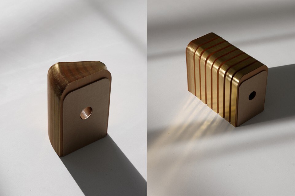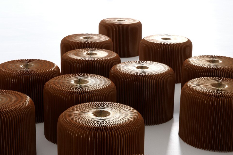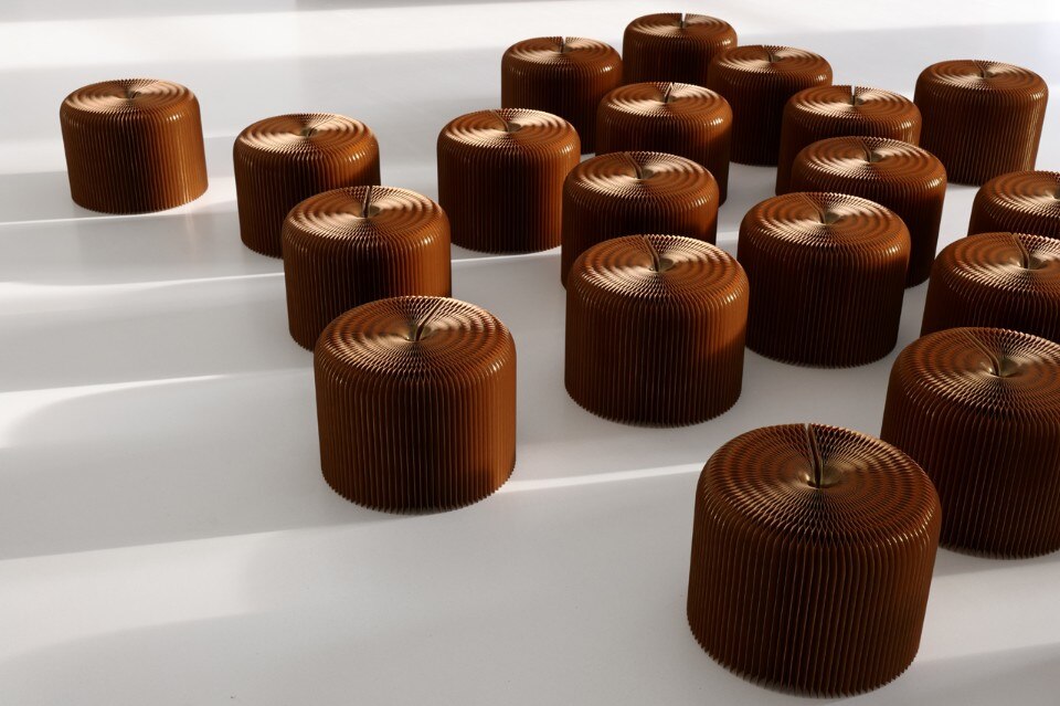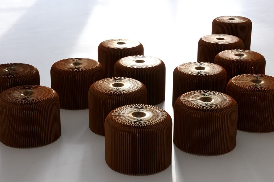 “We wanted to honour and celebrate paper’s boundless contribution to the arts, so we have gilded a series of our paper Softseating fanning stools with 24k gold”, Stephanie Forsythe and Todd MacAllen explain. The seat compresses like a book for storage, fanning open into stools or low tables. Alternatively, it connects magnetically to form long, winding benches.
