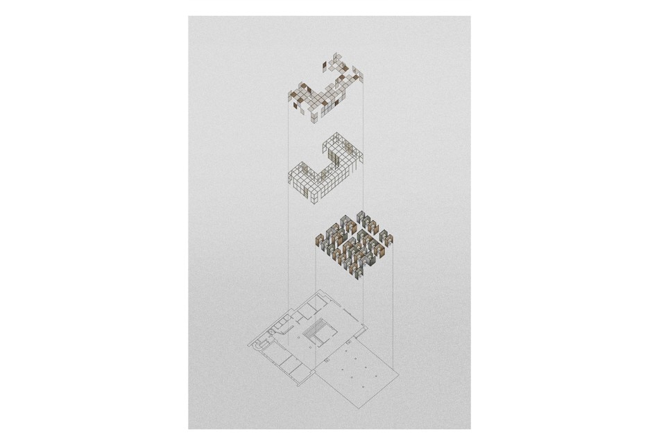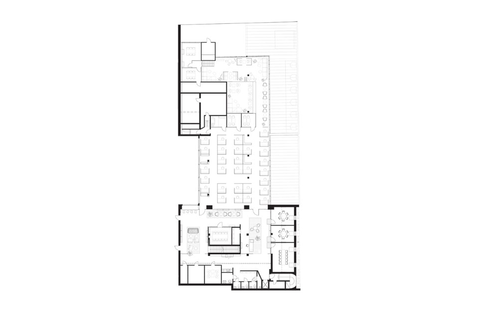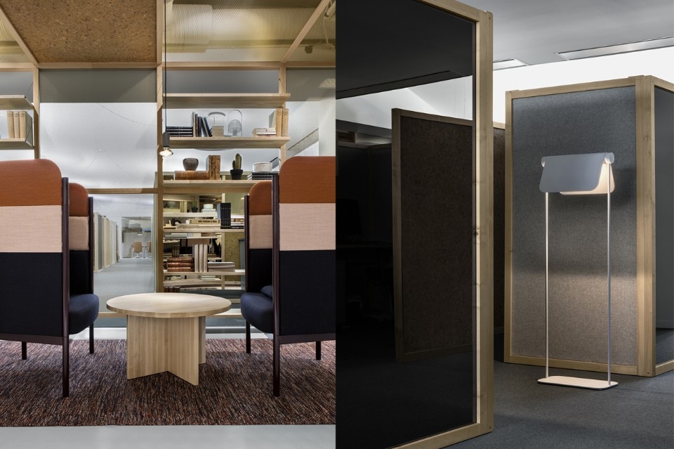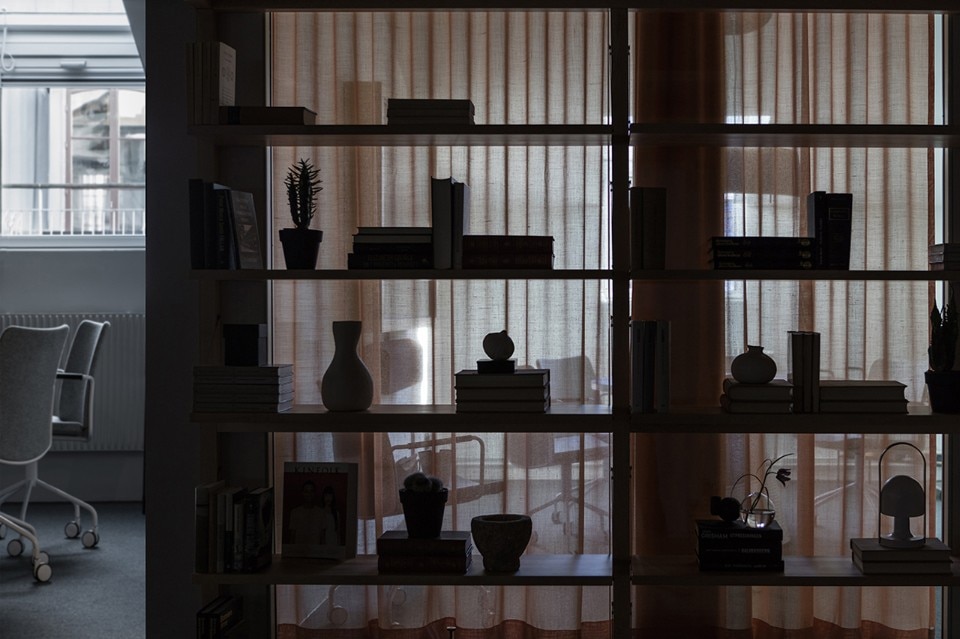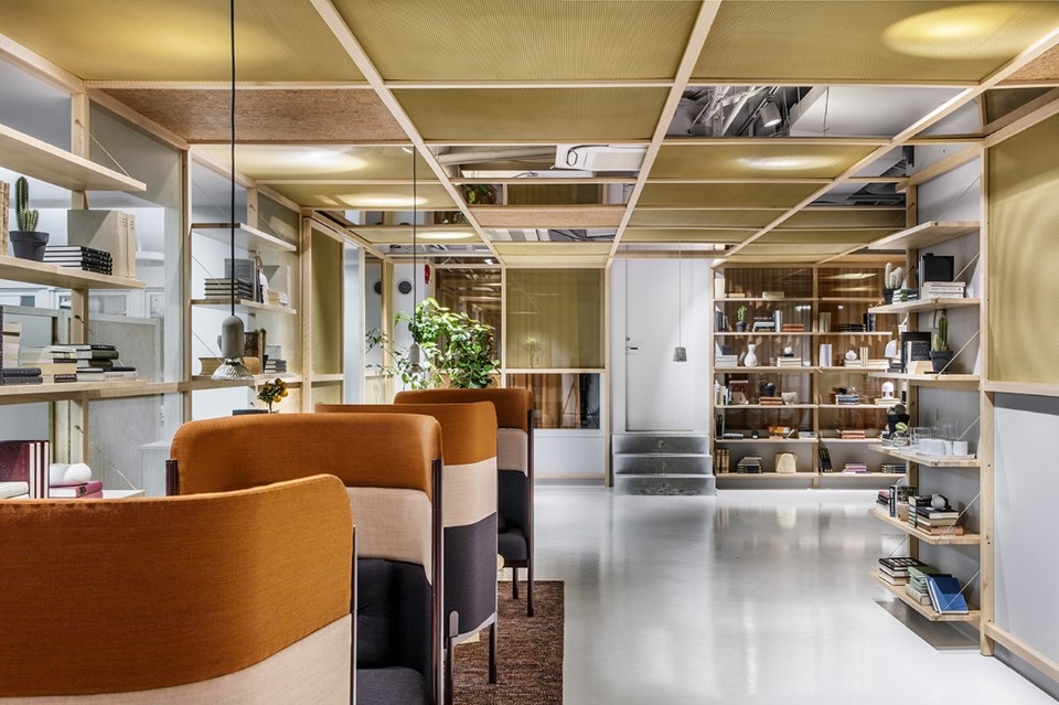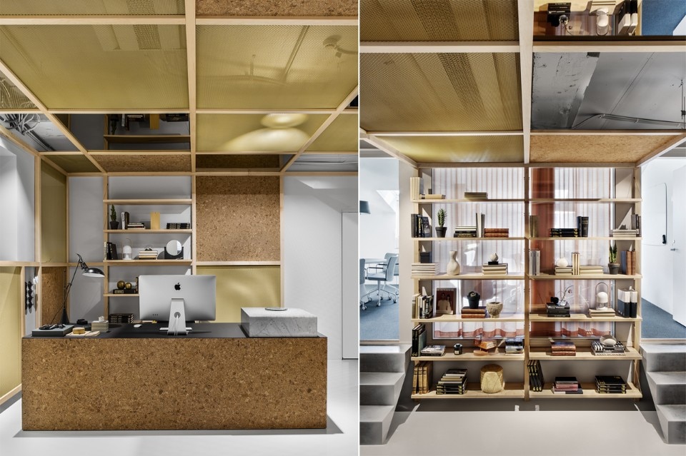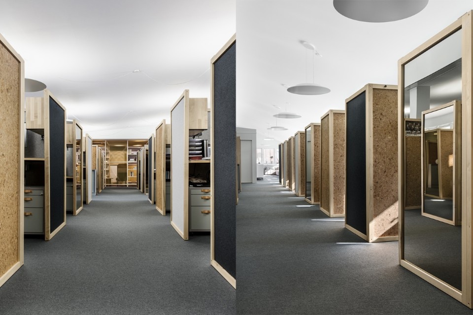 At its core, the company had concepts such as transparency, efficiency, excellence and mindfulness. The architects’ interpretation of this was to create an open and social workspace without clear hierarchies. The entrance lobby, surrounded by a wooden structure made of maple with shelves, mirrors, cork and brass net, acts both as a workspace for the employees, as well as a place to meet customers. Without any cellular office, workplaces are all the same size separated by maple wooden frames. Felt, mirrors and cork inside the frames create privacy and noise reduction.