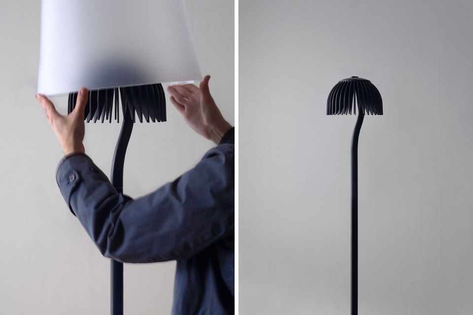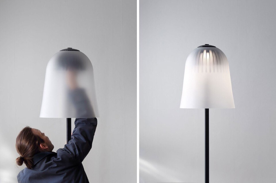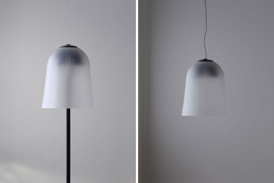 The curve of the heat sink and the curve of the glass start off together at the top of the bell, but slide apart as they move downwards, adding a gradient of blur or “bokeh” on the traces of the hard and industrial internal core seen through the pure surface of the glass. From being softened by their distance to the glass, these traces become projected shadows, like images on a camera’s ground glass when the light source is turned on.