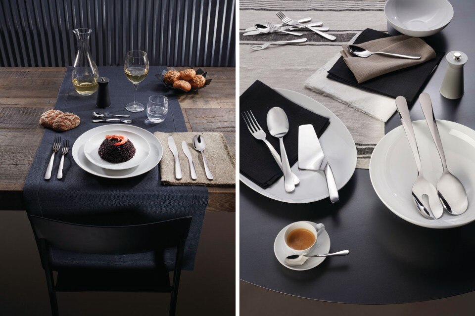 A three finger concept for the holding and balance of the cutlery has been adopted in the design. The weight of the cutlery transfers from the lifting position to the position when in use, thereby supporting and balancing the utensils in both situations. The name Giro originates from the Italian word for “turn”, referring both to the twist in the geometry and how the cutlery is turned in your hand when finding the best position for use. The architectural twist has been a key feature in the design of a number of UNStudio projects of varying scales – from buildings to pavilions – and has now been adapted in the design for the Giro cutlery set. In Giro the architectural curve is scaled down and transformed into a tactile framework on the human scale, one that is directly related to the body and to touch.