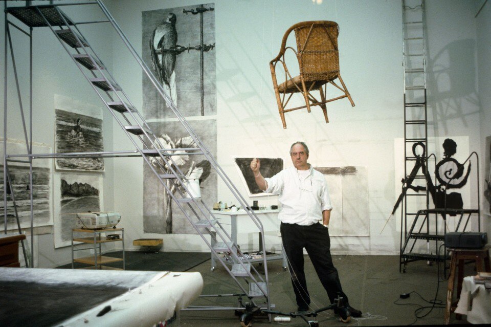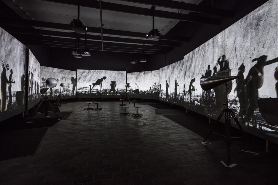 As an introduction to Kentridge’s universe the exhibition shows the ten films Drawings for Projection (1989–2011); as well as the computer-controlled puppet theatre Right Into Her Arms (2016), which has its origin in Alban Berg’s unfinished opera Lulu; 7 Fragments for George Méliès, Day for Night and Journey to the Moon (2003), a nine-screen installation whose premiere was received with great enthusiasm by the reviewers at