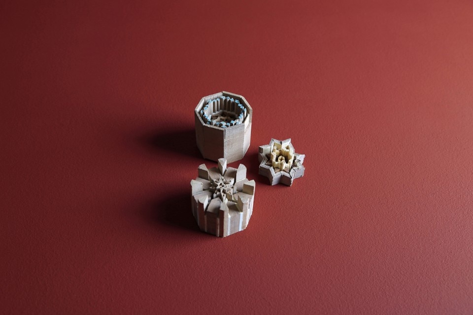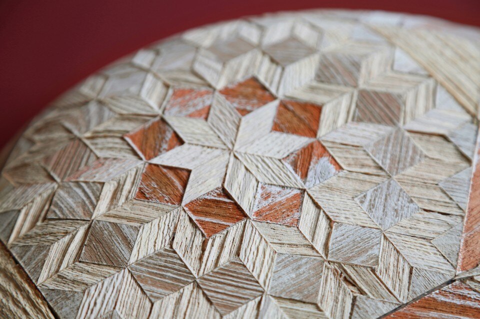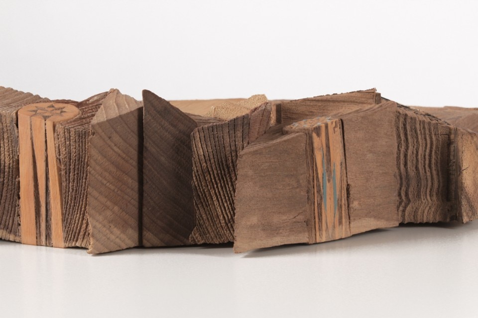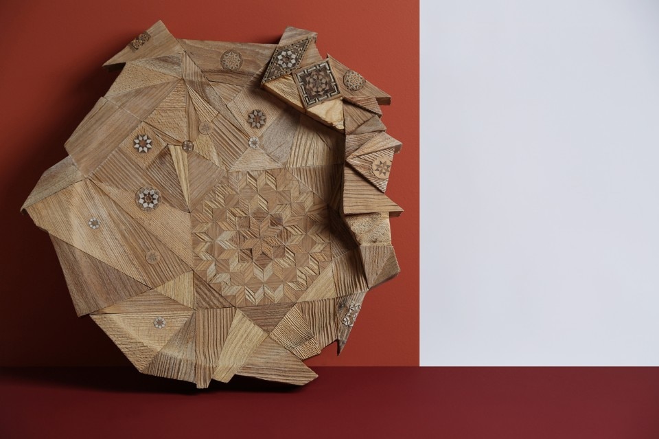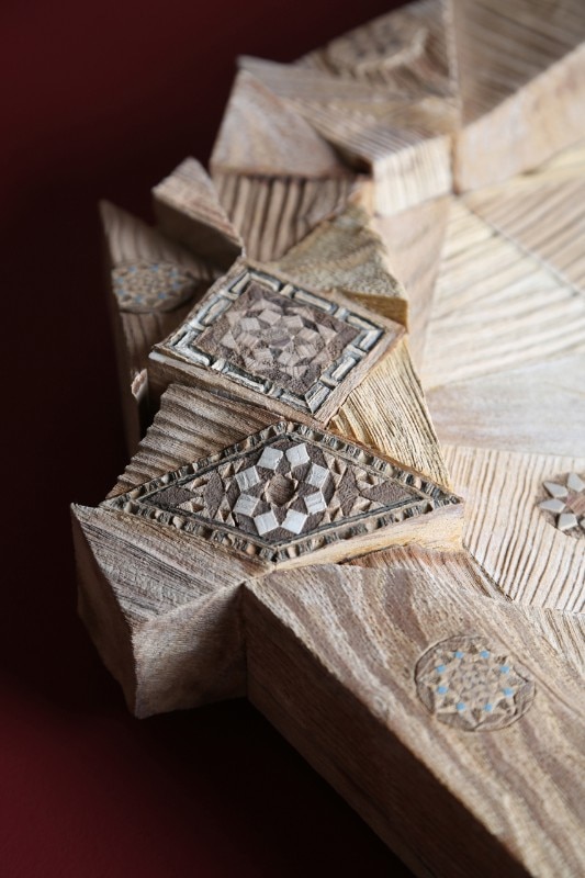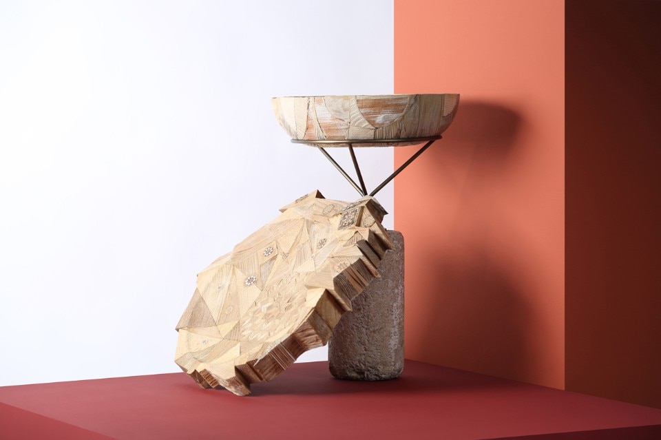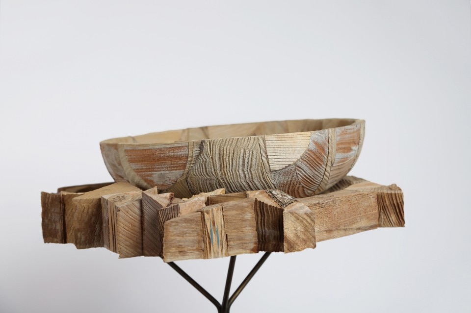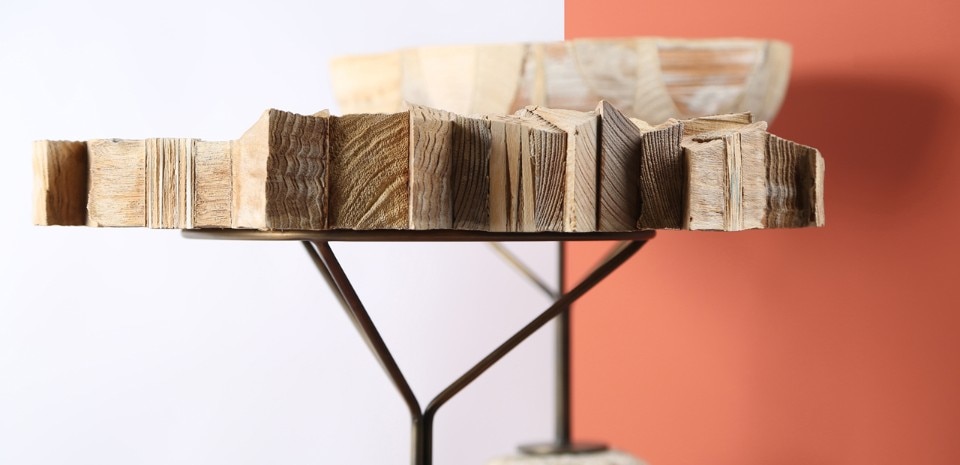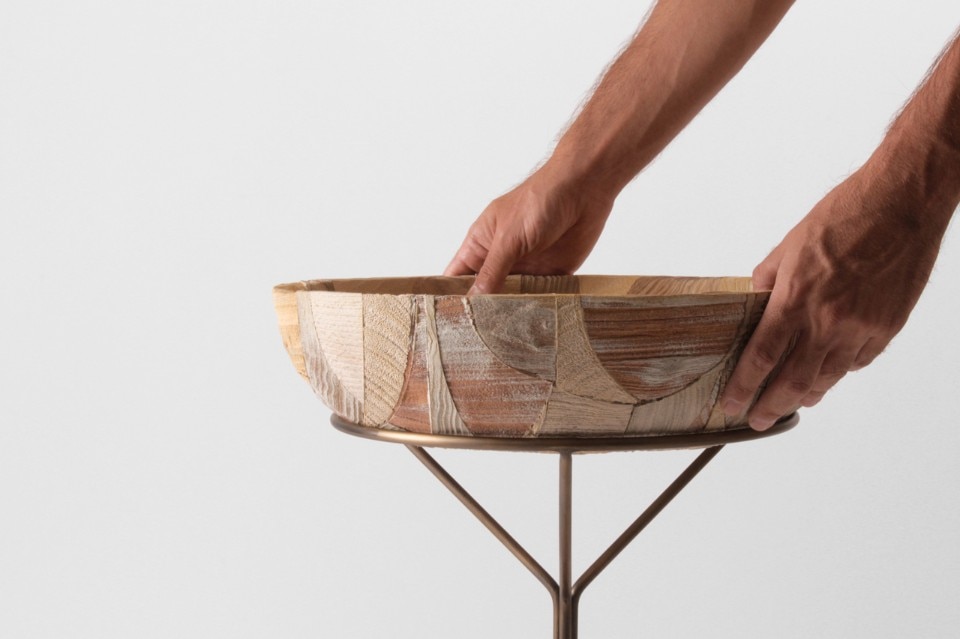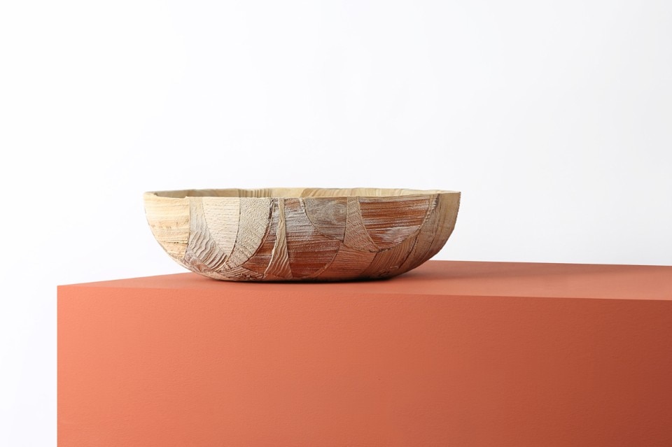 The series of trays and bowls is crafted by Lebanese marqueters, a team of expert artisans that have inherited the traditional Levant techniques. Some pieces look unfinished, while others have a round clean edge finishing. Wonderwood is crafted by hand linishing, polishing, sandblasting and then treated with acid and a thin layer of wax, to preserve the feel of the product.