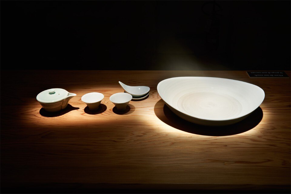 The concepts presented include an induction table that interacts with objects placed on it, such as Ginsa-no-suki, a wooden basket filled with silver beads that are warmed by the heat emitted by the table-top to the perfect temperature for serving saké; and Gin-yu, an induction-compatible tea-set in handmade ceramic traditionally decorated with silver motifs – using the ancient Ginsai technique – which reacts to the induction top and gently heats the water inside.