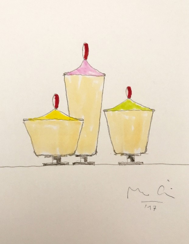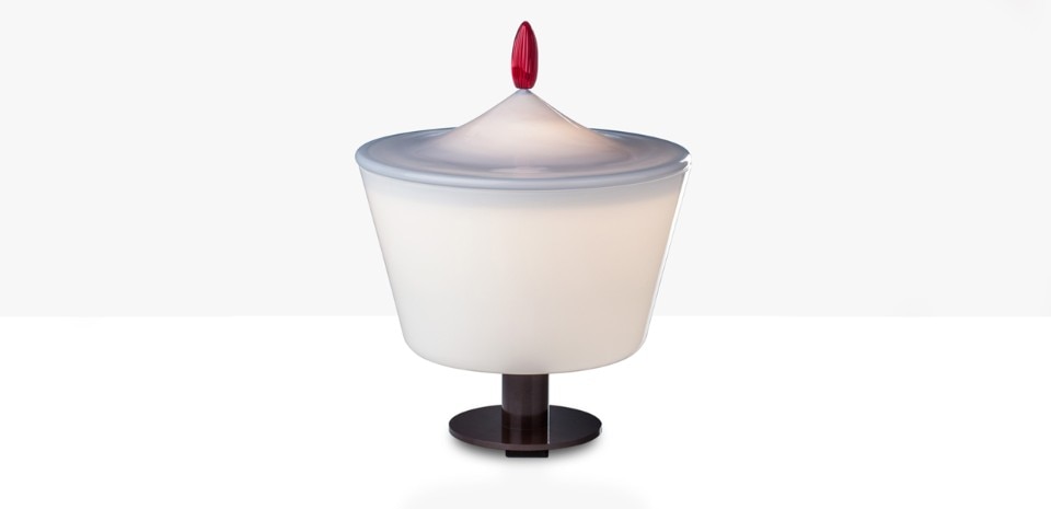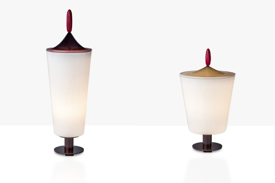 The Lou collection designed by Aldo Cibic for Venini is a hybrid between a vase and a lamp, with a slightly oriental feel. In fact, the objects are shaped like opal vases which stand on a bronze-coloured metal base.